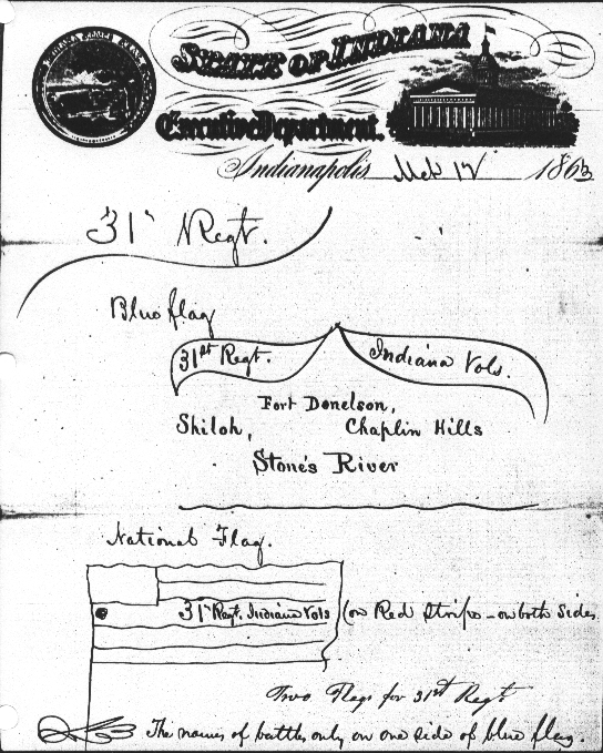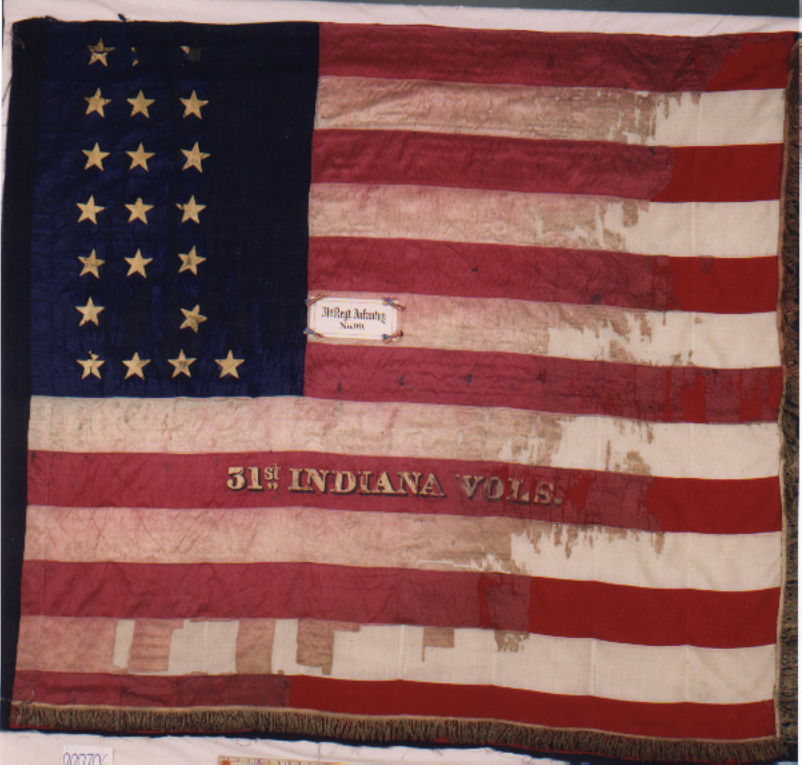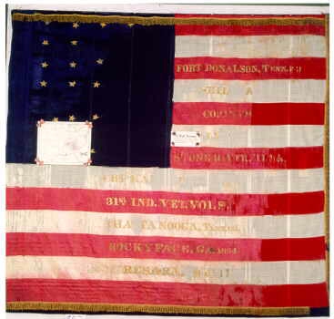 more InfoFlag No. 97 in the Indiana War Memorial Flag Collection: This particular Flag has a Map attached showing the regiment's movements during the Civil War. This Flag is a later National Flag for the 31st Indiana Volunteer Infantry. The Major Battles that the regiment fought in are listed on the Flag as follows along with the regiment's name on the fifth from the top red strip. Notice near the middle is "31st IND. VET. VOLS.". This indicates that the Regiment was reorganized as a Veteran Regiment in January of 1864. This means that several of the men had signed up to serve until the end of the war, even if their 3 year enlistment term expires, (which would be September 1864). They were proud to be called a "Veteran Regiment". However many later felt cheated due to the fact that they were sent to Texas after the Civil War had officially ended.