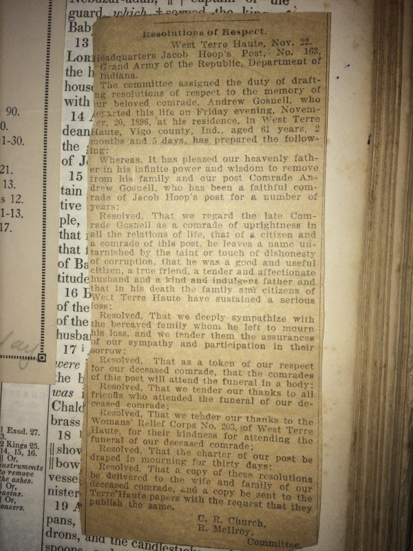This newspaper notice was found in his daughter's, Bertha Gosnell Cummins'
